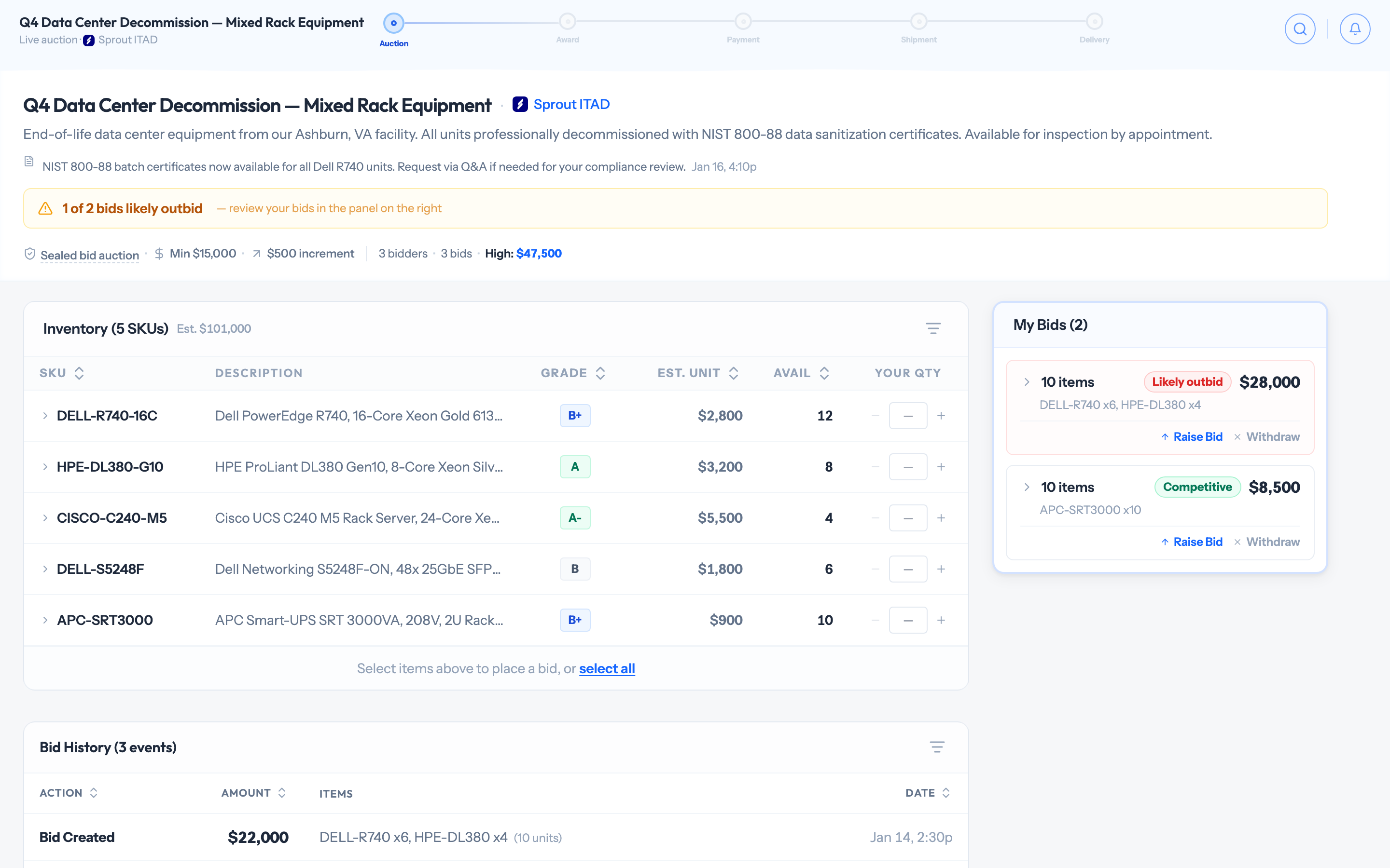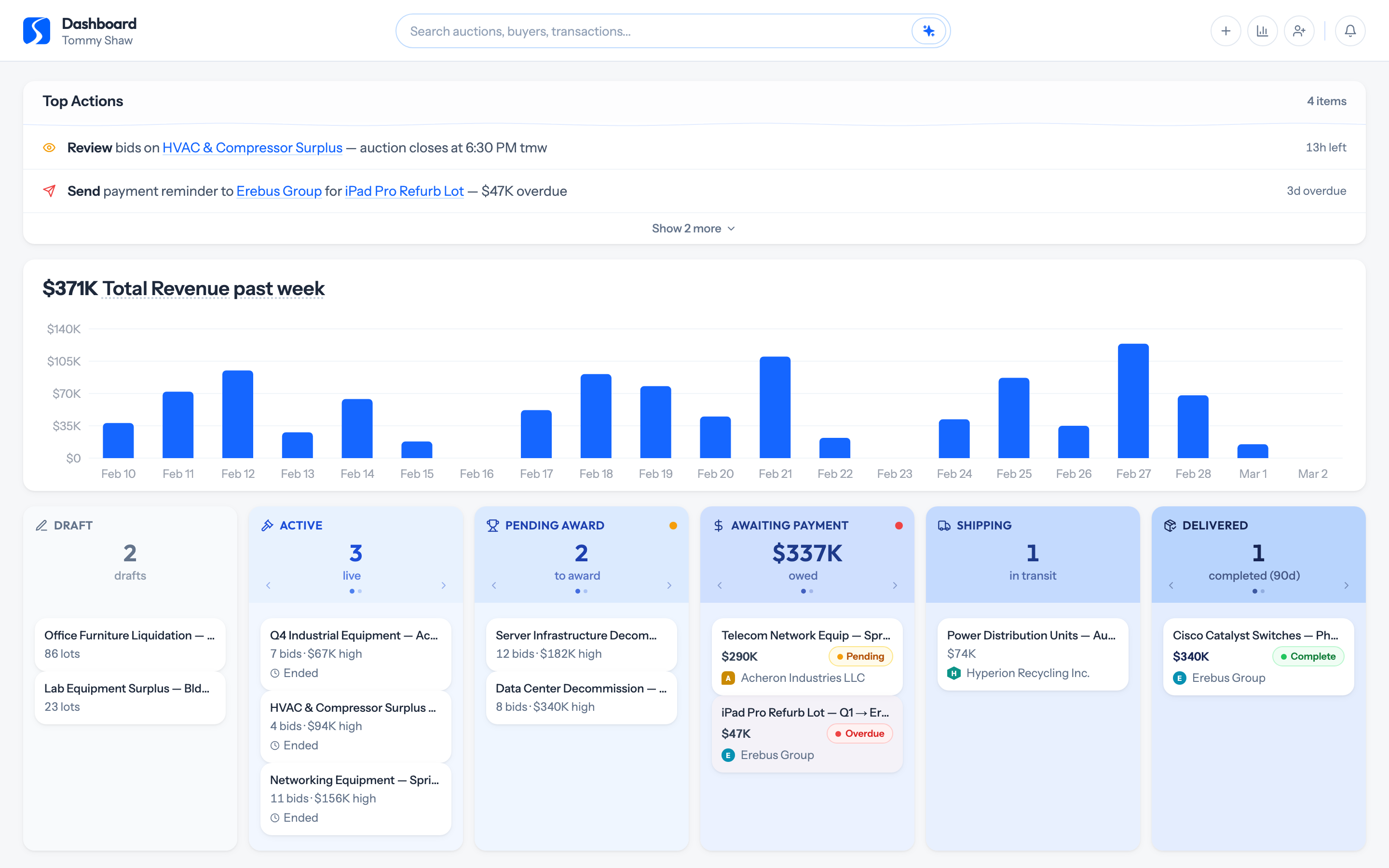 Efficient, standardized asset sales at scale. AI-powered bid optimization across complex lots. Maximum total recovery on every sale.